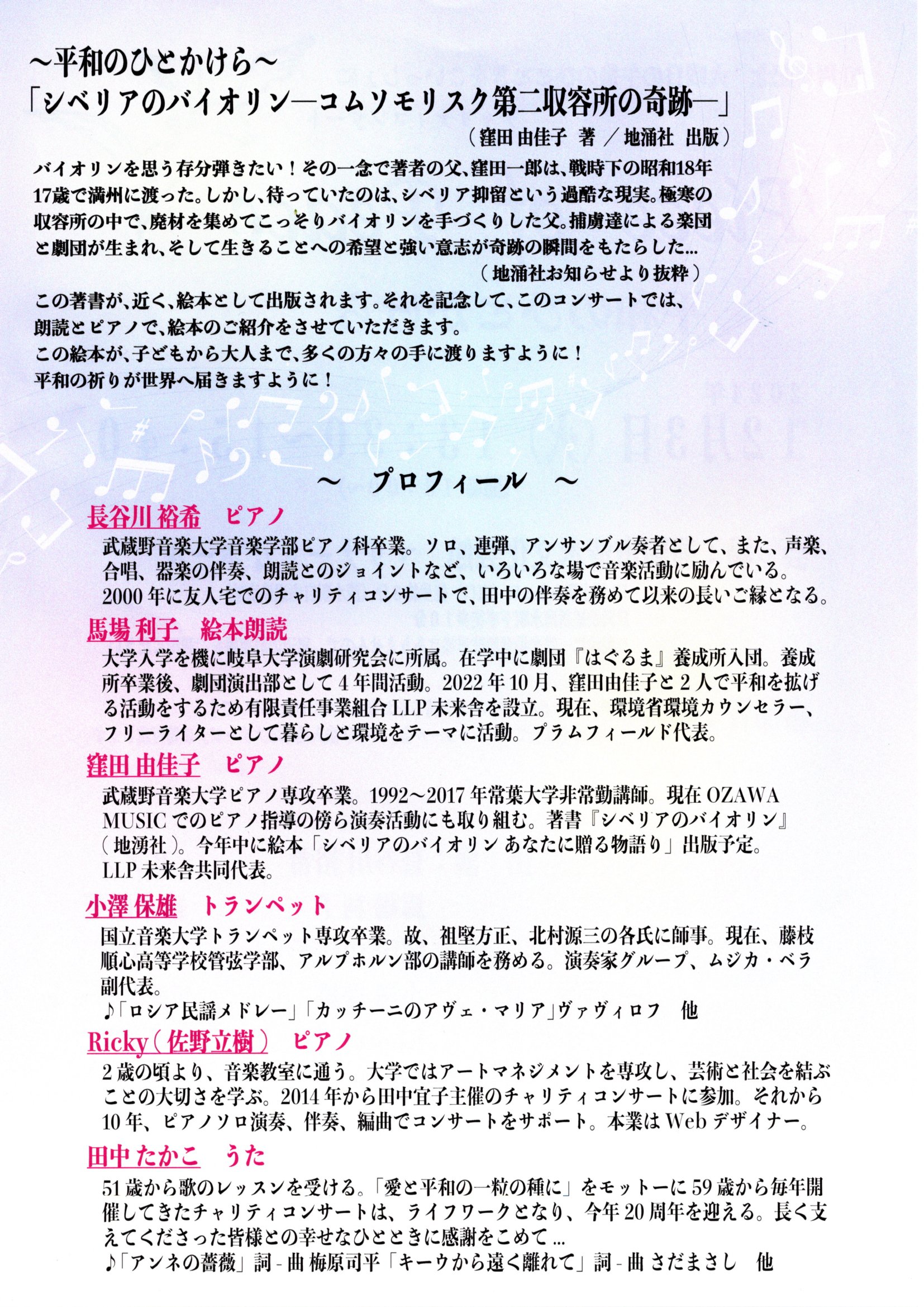 田中宜子さんが主催する第20回チャリティコンサートで、12月に出版する絵本『あなたに贈る物語~シベリアのバイオリン』(LLP未来舎が企画)の紹介をします。絵本の朗読を馬場利子が、窪田由佳子さんはパートナーであるトランペット奏者:小澤保雄さんと協演し、平和への想いをお届けします。絵本の原作となる小説『シベリアのバイオリン』の誕生は、田中宜子さんと窪田由佳子さん、馬場利子の出合いから実現した出版に至る逸話もお話をします。お時間がありましたら、お出かけください。