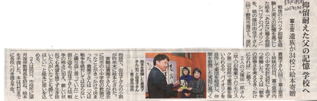 ■2025年1月10日、富士宮市立富丘小学校の6年生(約100名)を対象に平和教育の一環として、窪田由佳子さんが講演を行いました。その後、富士宮市内の全小中学校34校に、絵本『あなたに贈る物語~シベリアのバイオリン』を窪田由佳子さんと妹(元富士宮市教員)の深澤貴美子さんが寄贈しました。