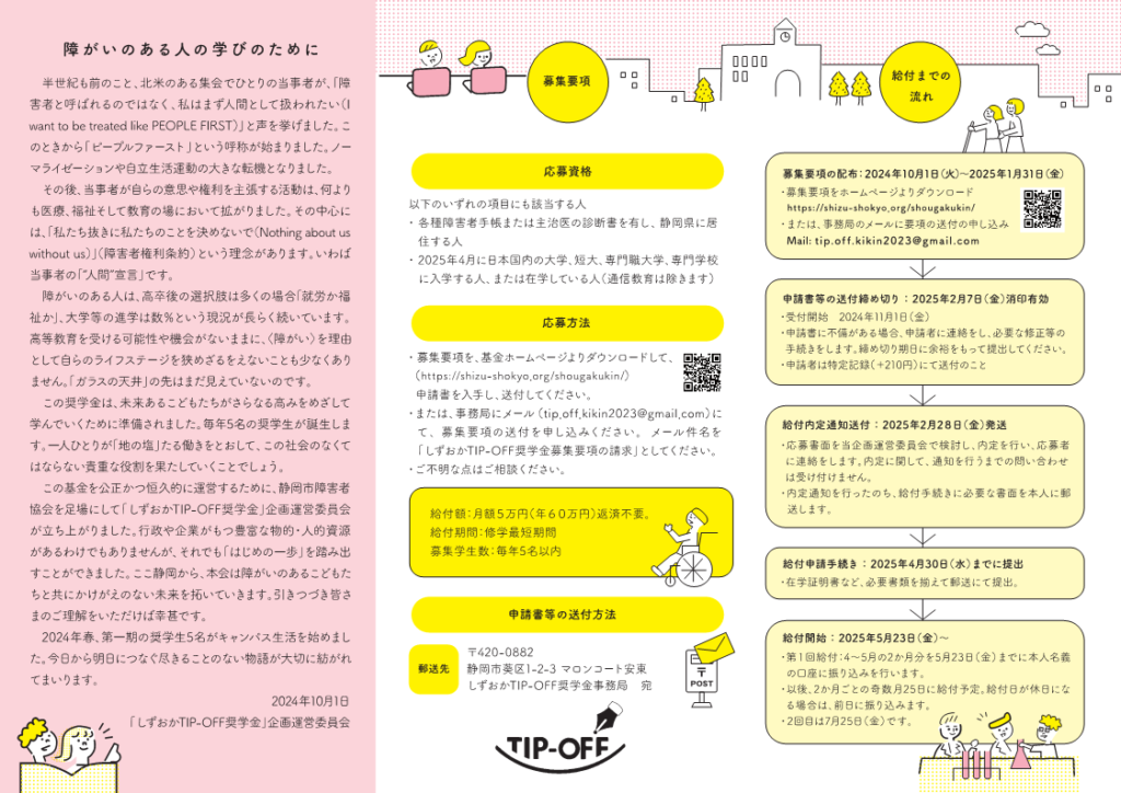 2024年度、篤志家の寄付を受けて『障がいのある人の返済不要の奨学金』(しずおかTIP-OFF奨学金)を設立し、