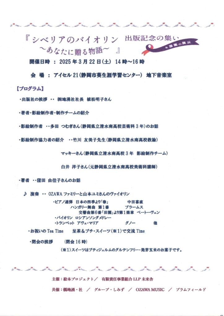 🔶3月22日(土)絵本『シベリアのバイオリン~あなたに贈る物語』の出版記念の集いを無事、終了しました。小説『シベリアのバイオリン』は、クラウドファンディングによって、出版。今回の絵本は、多くの人の協力を得て【絵本プロジェクト】によって、出版することができました。