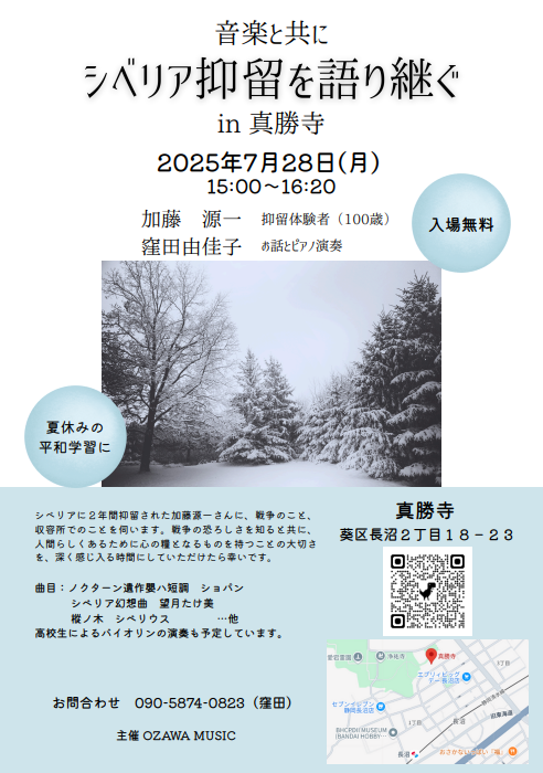 ■『シベリアのバイオリン』の著者:窪田由佳子が、7月28日(月)に静岡市葵区の真勝寺で抑留体験者の加藤源一さんと講演会を開催します。 2025年7月11日 最終更新日時 : 2025年7月11日 miraisya 音楽と共にシベリア抑留を語り継ぐin真勝寺 日 時:2025年7月28日(月)15:00~16:20場 所:真勝寺(静岡市葵区長沼2丁目18-23) 加藤 源一 抑留体験者(100歳)窪田由佳子 お話とピアノ演奏 入場無料 お問合わせ 090-5874-0823(窪田) ※詳細はチラシをご覧いただけます。 SNSでシェアをお願いします。