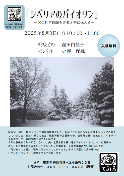 ■『シベリアのバイオリン』の著者:窪田由佳子が、8月9日(土)に静岡市清水区の龍津寺で講演会を開催します。 2025年7月11日 最終更新日時 : 2025年7月11日 miraisya 戦後80年「シベリアのバイオリン」~父の抑留体験を音楽と共に伝える~ 日 時:2025年8月9日(土)10:00~11:00場 所:龍津寺(静岡市清水区小島町135) お話とピアノ 窪田由佳子トランペット 小澤 保雄 入場無料 お問合せ:054-393-3028(勝野) ※詳細はチラシをご覧いただけます。 SNSでシェアをお願いします。